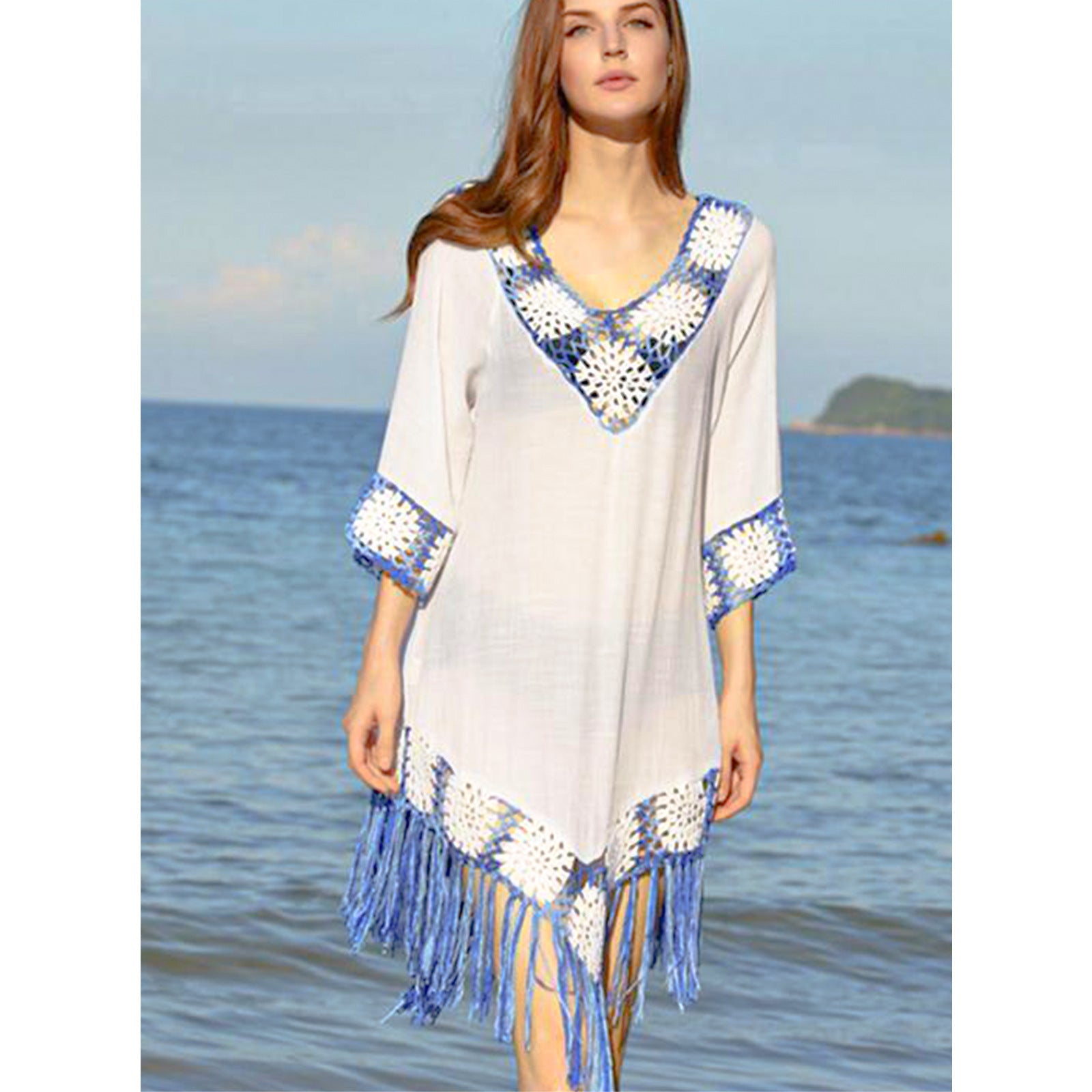 Ladies airy beach tunic with fringed details and crocheted pattern Ivyshape