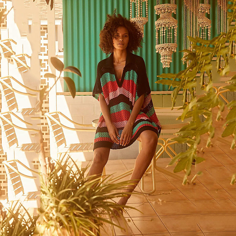 This elegant knitted beach poncho from Ivyshape perfectly combines style and comfort. With its extraordinary design and fashionable contrast stripes in soft colors, it is the ideal companion for beach days and relaxed summer evenings.