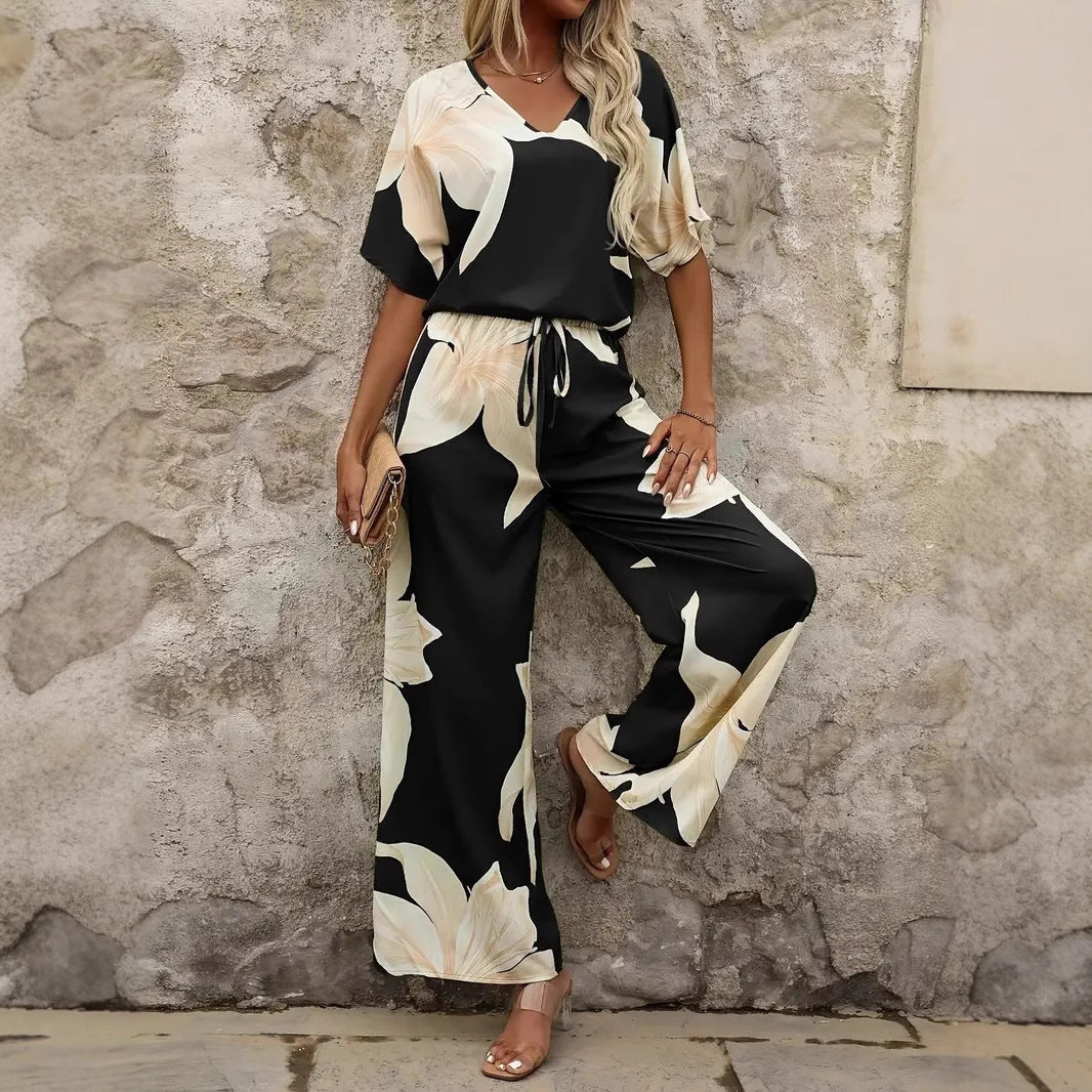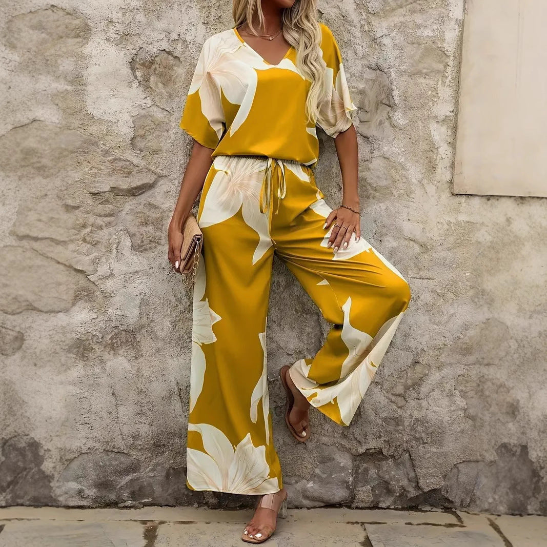 Our women's set with floral design and elastic waistband is the perfect choice for a casual yet elegant look. Ideal for summer, this set offers comfort and style in one.