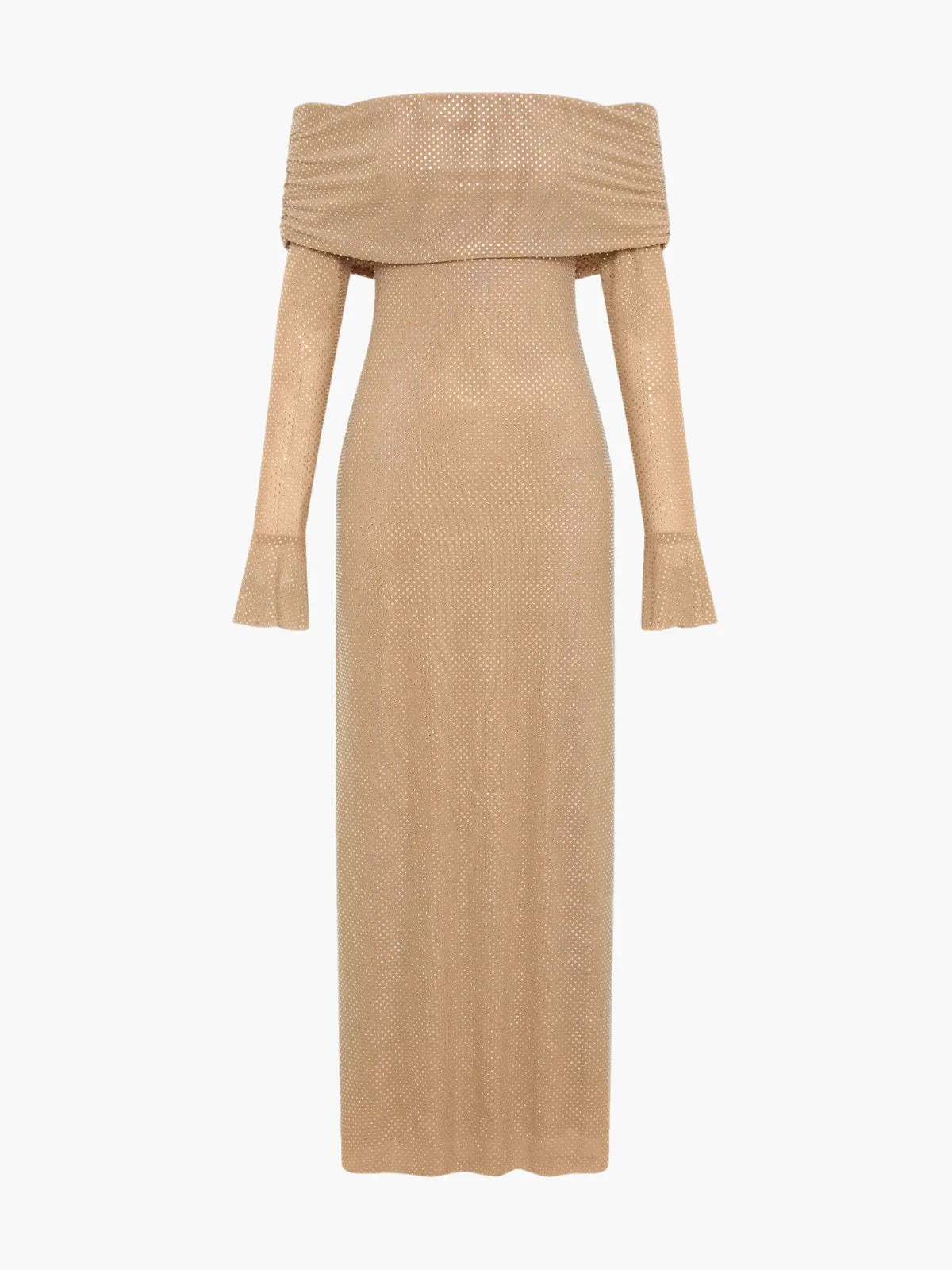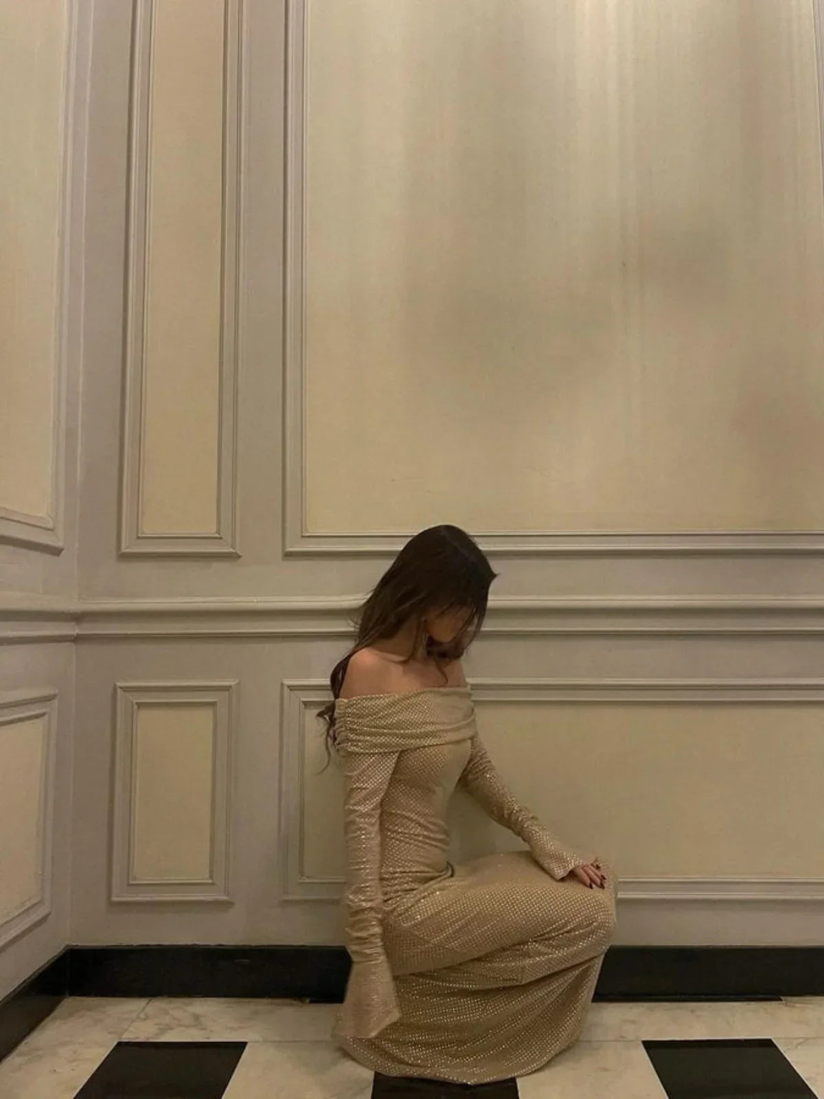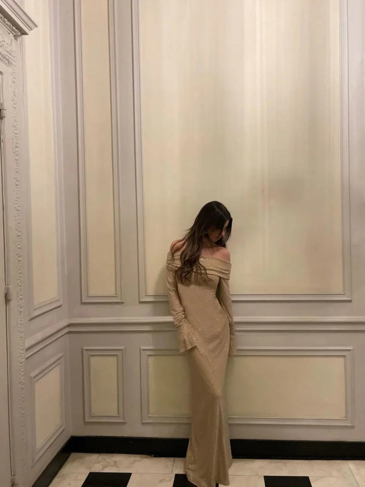 Step into the spotlight with the Lumina™ Gown, designed to dazzle from every angle. Featuring a luxe off-the-shoulder neckline and sheer long sleeves, this figure-hugging masterpiece is adorned with glimmering rhinestones that shimmer with every move. Perfect for red carpets, galas, or upscale soirées, this gown is made for unforgettable entrances.